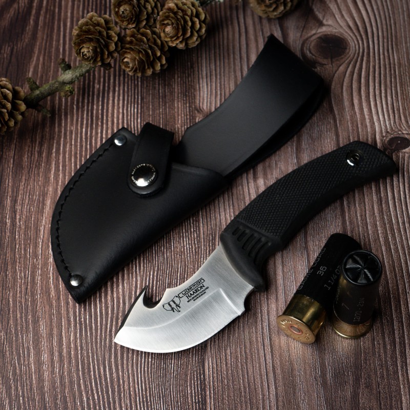 - Impugnatura in gomma nera antiscivolo. - Lama in acciaio 440. - Custodia in pelle inclusa.