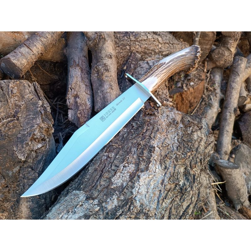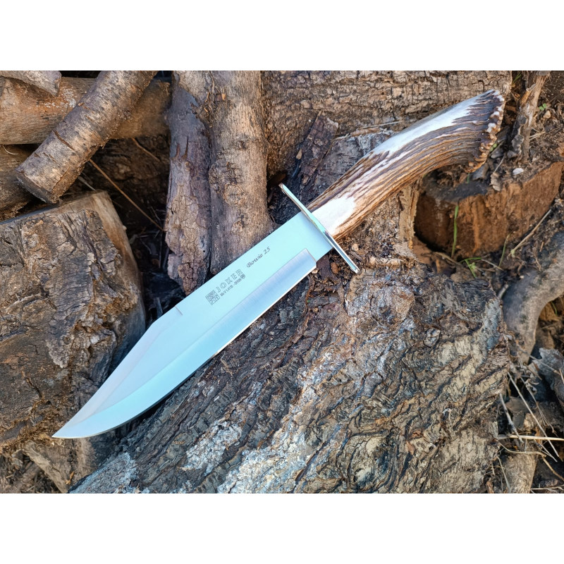 Coltello da caccia e sportivo Bowie del marchio Joker. Ha una lama da 25 centimetri, realizzata in acciaio inossidabile MOVA 1.4116, finitura satinata, larghezza lama 5 cm e finitura lama con punta a clip. Il mago è rifinito con un bracciale a corona di cervo, con una lunghezza di 13,5 centimetri. Le dimensioni totali del coltello Bowie sono di 38 centimetri e pesano 525 grammi. Questo coltello è stato progettato e prodotto ad Albacete (Spagna)