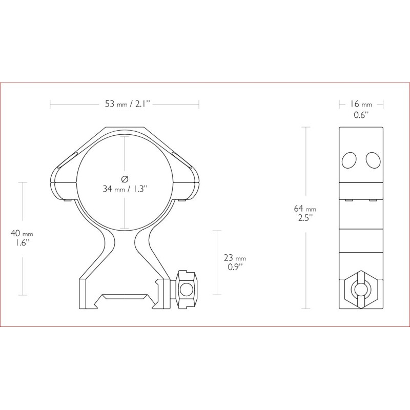 <p>Modello Alto</p> <p>Dimensione dell'anello (diametro) 34 mm</p> <p>Tessitore di rotaie</p> <p>Configurazione, pezzo m2</p> <p>Fissaggi (Superiore) Doppio Torx (T15)</p> <p>Filettatura (superiore) 6-48</p> <p>Fissaggi (binario) Dado esagonale (1/2")</p> <p>Filettatura (binario) 8-32</p> <p>Cuscino interno No</p> <p>Perno di arresto del rinculo retrattile No</p> <p>Altezza 2.5" 64mm</p> <p>Peso: 8,5 once, 242 g</p>
