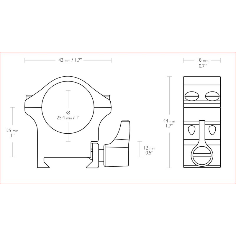 <p>Modello medio</p> <p>Dimensione dell'anello (diametro) 1 pollice</p> <p>Tessitore di rotaie</p> <p>Configurazione a 2 pezzi</p> <p>Attacchi (in alto) Double Torx (T15)</p> <p>Filettatura (superiore) 8-32</p> <p>Elementi di fissaggio (binario), leva e dado esagonale (1/2")</p> <p>Filettatura (binario) 8-32</p> <p>Cuscino interno Sì</p> <p>Perno di arresto del rinculo retrattile No</p> <p>Altezza 1.7" 44 mm</p> <p>Peso 7.7 oz 217 g</p>