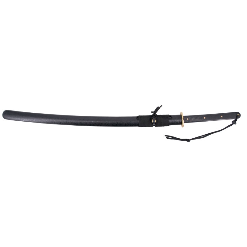 Funzionale katana affilata con lama solida S6033 di 100 cm in acciaio al carbonio 1065 lama con filo, con fodero nero e cordino nero, manico in plastica testurizzata, con scatola in legno foderata e supporto di presentazione. Codice S6033
