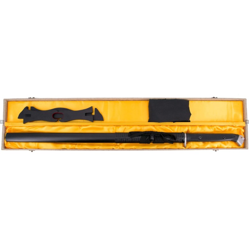Funzionale Katana S2026 di lama in acciaio al carbonio 1065 da 102 cm con filo, con fodero nero e cordino nero, manico in plastica testurizzata, con scatola in legno foderata e supporto di presentazione.