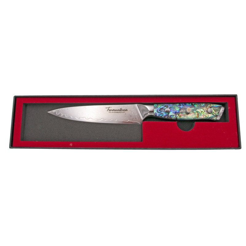 Coltello da cucina Tramuntana modello CD12 Utility Lama in acciaio damascato VG10 di 67 strati da 12,5 cm, manico in abalone con resina epossidica, con scatola di presentazione.