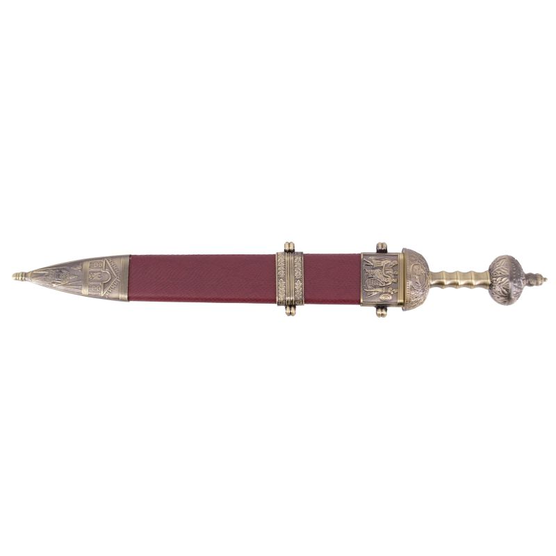 Spada Gladius rifinita in bronzo e fodero in rosso, con una dimensione totale di 100 cm con lama in acciaio.