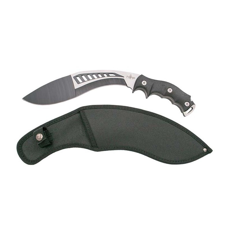 Coltello tattico stile Kukri, manico in ABS nero, con fodero in nylon nero.
