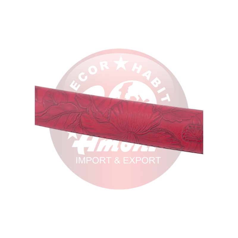 Katana S6040 funzionale con lama in acciaio damasco rosso da 104 cm, fodero in legno foderato in ecopelle rossa con dettagli a fiore di loto, manico con cordino rosso in vera pelle di razza. Con supporto.