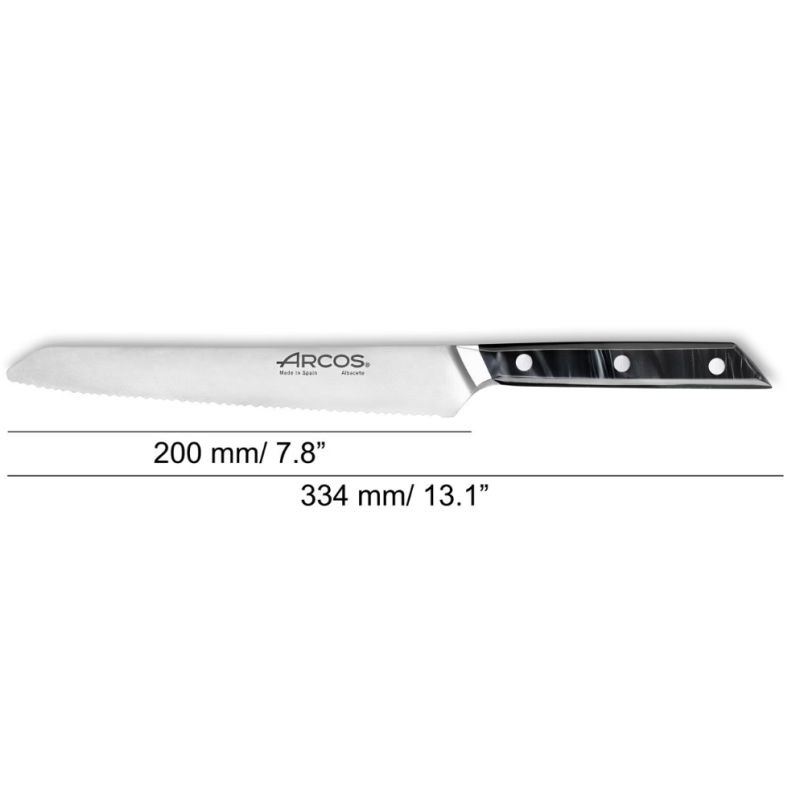 <p>Coltello da pane della nuova serie Eclipse, prodotto da ARCOS ad Albacete, Spagna</p> <p>Materiale lama: acciaio inossidabile forgiato NITRUM®</p> <p>Filo Seda Plus</p> <p>Materiale manico: Acrilico (PMMA) con riflessi unici su ogni pezzo.</p> <p>Forgiato in un unico pezzo.</p> <p>Dimensione della lama: 20 cm</p> <p>Dimensione intera: 33,4 cm / 13,1"</p> <p>Bordi smussati.</p>