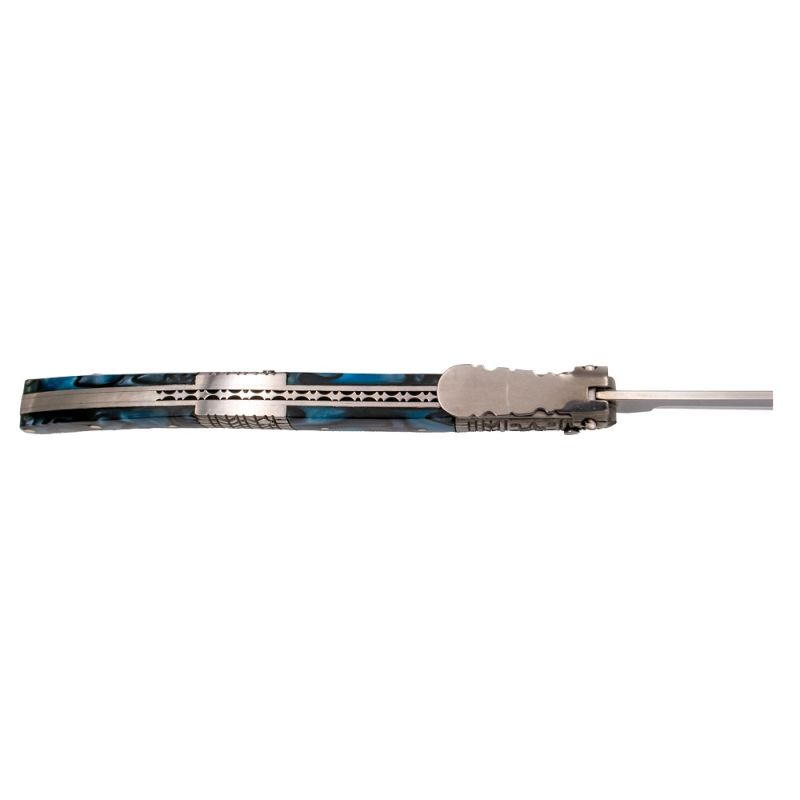 Manico con ghiere in acciaio inox con bassorilievo decorativo basato sui classici coltelli spagnoli del XIX secolo e inserti in acrilico blu