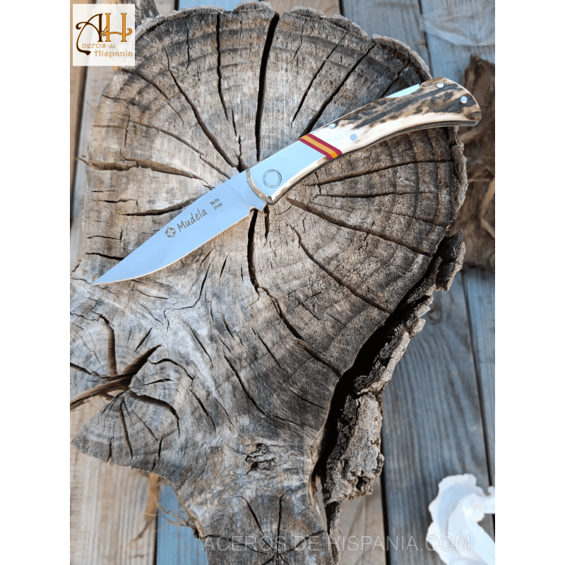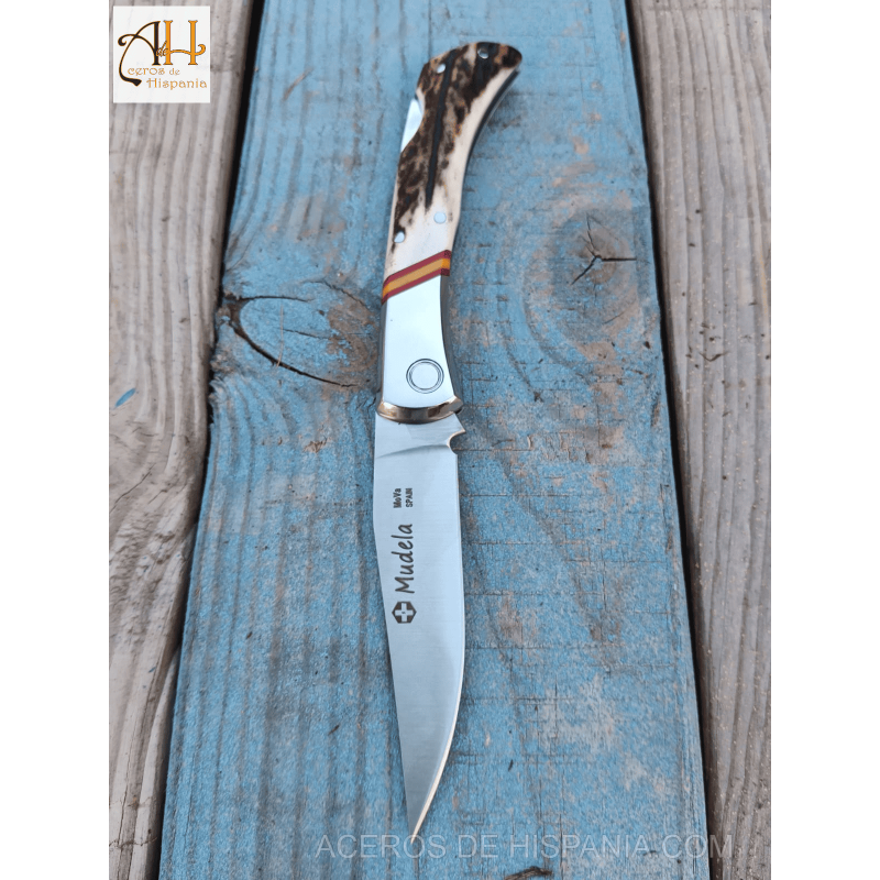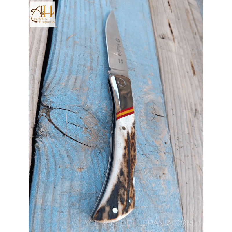 • Manico realizzato in autentico corno di cervo, con la bandiera della Spagna incastonata nei manici.