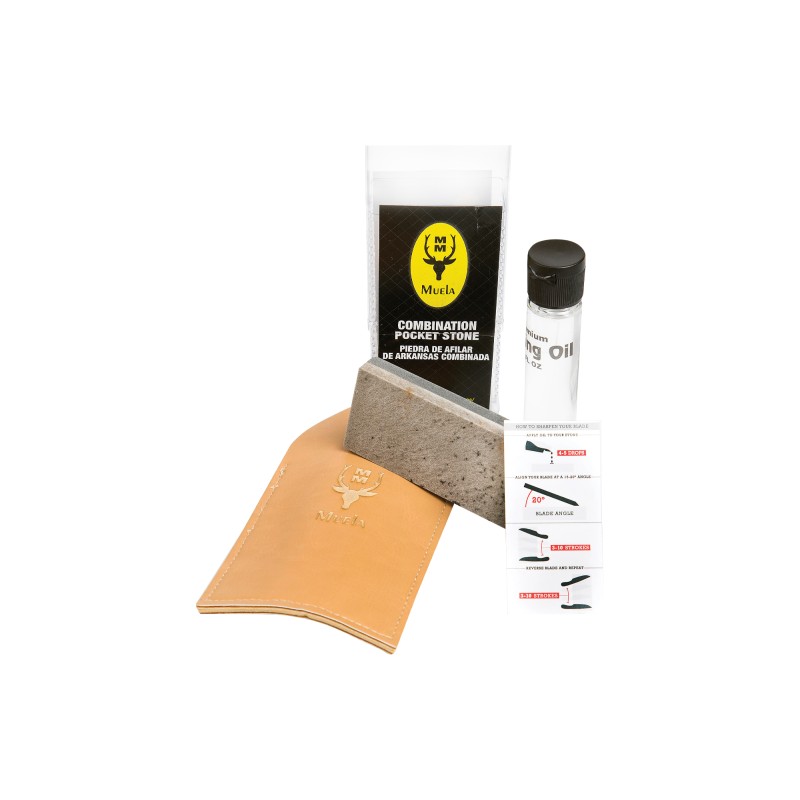 Il set è composto da una pietra naturale combinata dell'Arkansas di grana media e fine, nonché da una custodia in pelle e da un olio minerale specifico per l'affilatura.