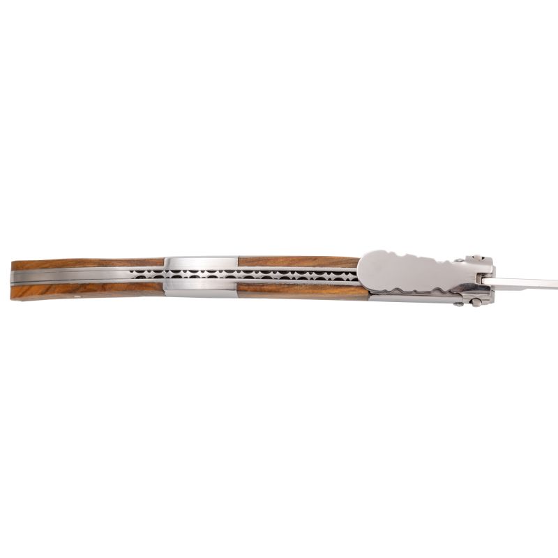 Coltello a cricchetto di Third Amber Serie N54O, realizzato con tecnologia CNC, manico con ghiere in acciaio inox rifinite in lucido a specchio e inserti in legno d'ulivo, lama in acciaio 440 rifinita in specchio lucido di 13 cm, con molla e billetta decorati. Con scatola di presentazione.