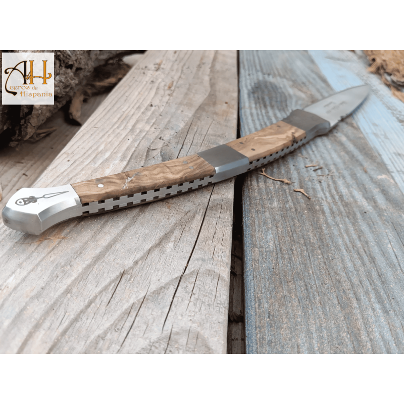 Il coltello commemorativo della battaglia di Bailén ha una lama di 21,50 cm in acciaio MOVA 380, che raggiunge una lunghezza totale di 45 cm. I manici sono realizzati in legno d'ulivo originario di Bailén, simbolo delle radici locali e del legame con la terra andalusa. Pesa circa 340 grammi, il che gli conferisce solidità e presenza.