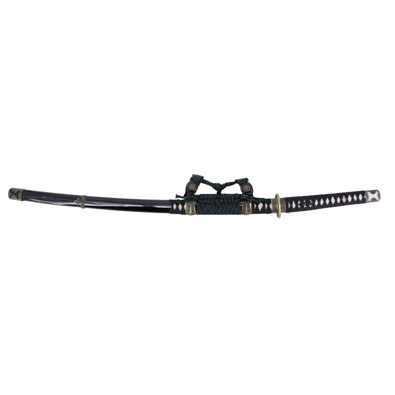 Include un fodero in legno nero laccato con eleganti dettagli metallici e un manico con cordino nero che offre una presa salda e confortevole. Questa sciabola giapponese è dotata di un espositore, perfetto per un abbigliamento elegante.