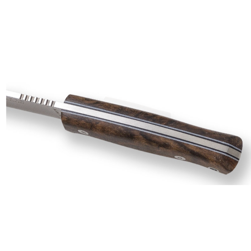 <p>Dimensioni del foglio: 11 cm</p> <p>Tipo di acciaio: Mova 1.4116</p> <p>Materiale manico: Noce</p> <p>Tipo di cassa: pelle</p> <p>Finitura foglia: Satinato</p> <p>Tipo di punta della lama: punto di goccia</p> <p>Dimensione totale: 22,3 cm</p> <p>Peso del prodotto: 195 gr</p> <p>Spessore lama: 3,5 mm</p>