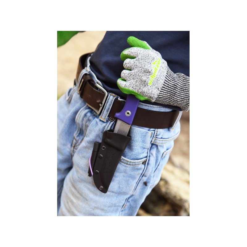 <p>Schnitzel coltello DU, per bambini, viola</p> <p></p> <p>- Materiale lama: acciaio inossidabile 14C28N con finitura anticorrosione </p> <p>- Materiale dell'impugnatura: G-10 in viola (disponibile anche in verde oliva, giallo e rosso) </p> <p>- Lunghezza totale: circa 18,5 cm </p> <p>- Lunghezza lama: circa 8,5 cm </p> <p>- Spessore della lama: circa 3 mm </p> <p>- Lunghezza manico: circa 10 cm </p> <p>- Spessore del manico: circa 14 mm </p> <p>- Include fodero in Kydex, supporto in acciaio antincendio (nero) e acciaio antincendio </p> <p>- Peso: circa 128 g (circa 176 g con custodia)</p>