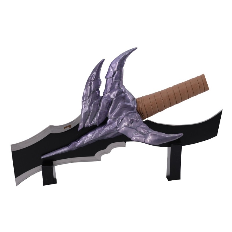 <p>Pugnale S3334 Pugnale modello Rasaka fang di Solo Leveling, replica non ufficiale, con una dimensione totale di 60 cm, lama in acciaio rifinita in nero con taglio satinato, guardia viola e manico rifinito in cordino marrone. Con supporto.</p> <p><strong></strong><br /><strong>Dimensioni totali: </strong> 60 cm<br /><strong>Dimensioni della lama: </strong> 77,3 cm<br /><strong>Spessore lama: </strong>3 mm<br /><strong>Appoggiare: </strong>Con il supporto<br /><strong>Peso:</strong> 1,75 kg</p>