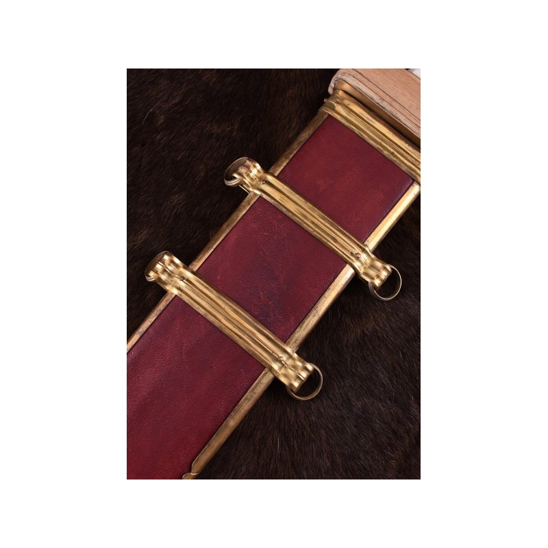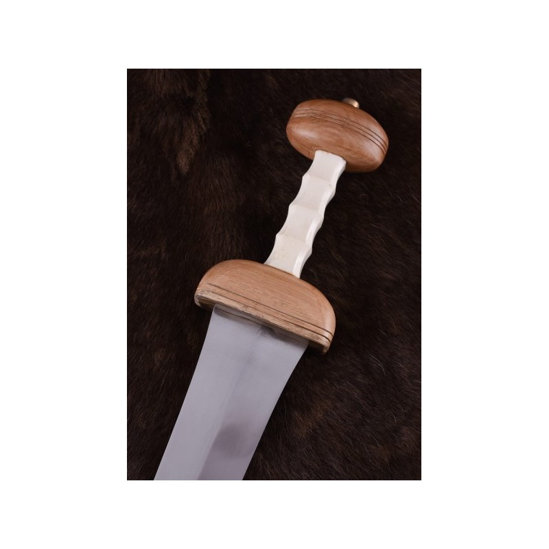 <p>Spada romana Gladius tipo Magonza con fodero, I secolo.</p> <p></p> <p> - Materiale: lama in acciaio per molle EN45 (acciaio al carbonio, non inossidabile), impugnatura in osso, protezione e manopola in legno, inserto e intarsio in ottone per paramani </p> <p>- Lunghezza totale: circa 71 cm </p> <p>- Lunghezza lama: circa 53 cm </p> <p>- Spessore della lama: circa 4,5 mm / 2,5 mm (taglienti circa 1 mm) </p> <p>- Lunghezza dell'impugnatura: circa 18 cm (sezione dell'impugnatura circa 9 cm) </p> <p>- Larghezza massima della lama: circa 6,5 mm (taglienti circa 1 mm). Larghezza della lama: circa 6,5 cm </p> <p>- Baricentro: circa 13 cm davanti alla protezione </p> <p>- Incl. fodero in legno con fodero in vera pelle e ferramenta in ottone </p> <p>- Peso senza fodero: circa 0,8 kg </p> <p>- Peso con fodero: circa 1,3 kg Le specifiche di cui sopra possono variare leggermente da un esemplare all'altro. L'acciaio utilizzato non è inossidabile e può presentare lievi segni di corrosione. Si consiglia una manutenzione regolare della lama e del fodero, ad esempio con Ballistol, un olio universale ideale per la conservazione degli utensili in acciaio.</p> <p></p>