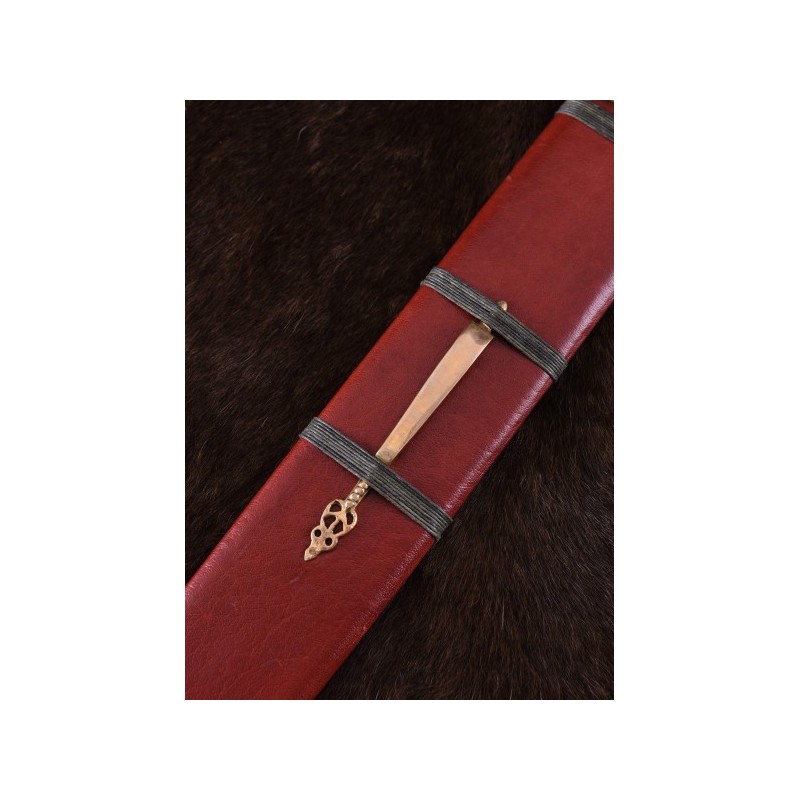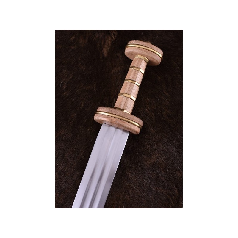 <p>Spada romana tipo Podlodów con fodero, III secolo.</p> <p></p> <p>- Materiale: lama in acciaio per molle EN45 (acciaio al carbonio, non inossidabile), manico in legno intarsiato in ottone </p> <p>- Lunghezza totale: circa 89 cm </p> <p>- Lunghezza lama: circa 73 cm </p> <p>- Spessore della lama: circa 4,8 mm / 3,8 mm (taglienti circa 1 mm) </p> <p>- Lunghezza dell'impugnatura: circa 16 cm (sezione dell'impugnatura circa 10 cm) </p> <p>- Larghezza massima della lama: circa 4,8 mm / 3,8 mm (taglienti circa 1 mm). Larghezza della lama: circa 4,8 cm </p> <p>- Baricentro: circa 17,5 cm davanti alla protezione </p> <p>- Incl. copertura in legno con rivestimento in vera pelle, raccordi in ottone e cavo di avvolgimento - Peso senza copertura: circa 1,1 kg </p> <p>- Peso con coperchio: circa 1,4 kg Le specifiche di cui sopra possono variare leggermente da un pezzo all'altro. L'acciaio utilizzato non è inossidabile e può presentare lievi segni di corrosione. Si consiglia una manutenzione regolare della lama e del fodero, ad esempio con Ballistol, un olio universale ideale per la conservazione degli utensili in acciaio.</p> <p></p>