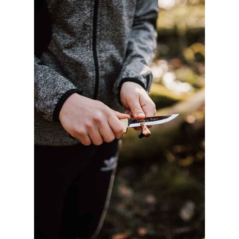 L'impugnatura in gomma testurizzata e la protezione per le dita garantiscono una presa salda. La lama è in acciaio inossidabile, di facile manutenzione. Il manico è progettato per adattarsi alla mano di un bambino, ma il coltello è anche uno strumento pratico per gli adulti per intagliare e svolgere lavori che richiedono precisione.