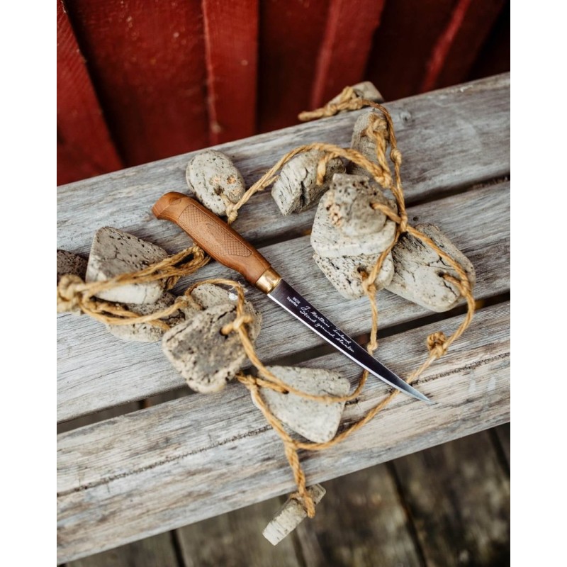 Il classico coltello per sfilettare è stato ridisegnato sia nell'aspetto che nelle caratteristiche. La lama è ancora più flessibile di prima. Il manico è realizzato in betulla finlandese trattata termicamente. I motivi superficiali applicati al laser gli conferiscono una consistenza che garantisce una presa più salda. Il manico è rivestito con cera protettiva.