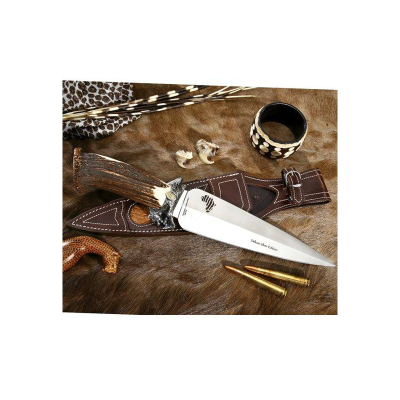 <p>- Coltello prodotto dal prestigioso marchio spagnolo Muela.<br />- Coltello da collezione dal design elegante e lussuoso. Edizione limitata e numerata di 150 esemplari.<br />- Manico in corno di cervo con rosetta decorata con pezzo in argento.<br />- Lama di circa 25 cm. in acciaio legato al cromo-vanadio.<br />- Guardia in argento con rilievo leopardato. Comprende due pezzi d'oro con inciso il numero di serie e lo scudo Masai.<br />- Lama controtagliente concava scavata a tre tavoli. Include incisione laser su entrambi i lati.<br />- Include una fodera in pelle con pezzo di pelle di coccodrillo del Nilo.<br />- Presentato in un cofanetto di legno con incisioni della serie African Safari in copertina.<br /><br />Se vuoi saperne di più su questo coltello e sulla collezione clicca <a href="https://www.aceros-de-hispania.com/infer.asp?ac=12&trabajo=listar&pa=cuchillos-muela-safari&sg=cuchillos-muela-safari" style="font-family:Arial;font-size:11.199999809265137px;line-height:15.199999809265137px;">qui</a></p>