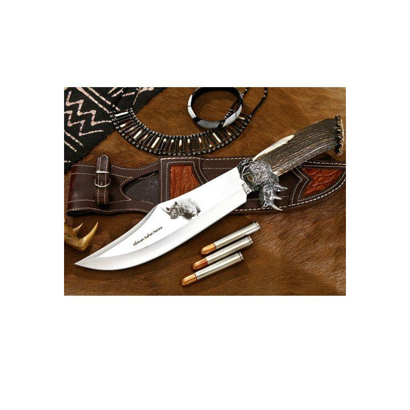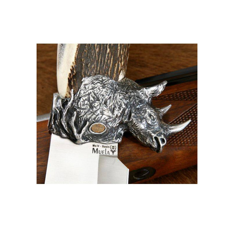 <p>- Coltello prodotto dal prestigioso marchio spagnolo Muela.<br />- Coltello da collezione dal design elegante e lussuoso. Edizione limitata e numerata di 150 esemplari.<br />- Manico in corno di cervo con rosetta decorata con pezzo in argento.<br />- Lama di circa 25 cm. in acciaio legato al cromo-vanadio.<br />- Guardia in argento con rilievo di rinoceronte. Comprende due pezzi d'oro con inciso il numero di serie e lo scudo Masai.<br />- Lama controtagliente concava scavata a tre tavoli. Include incisione laser su entrambi i lati.<br />- Include una fodera in pelle con pezzo di pelle di coccodrillo del Nilo.<br />- Presentato in un cofanetto di legno con incisioni della serie African Safari in copertina.<br /><br />Se vuoi saperne di più su questo coltello e sulla collezione clicca <a href="https://www.aceros-de-hispania.com/infer.asp?ac=12&trabajo=listar&pa=cuchillos-muela-safari&sg=cuchillos-muela-safari" style="font-family:Arial;line-height:15.199999809265137px;font-size:11px;">qui</a></p>