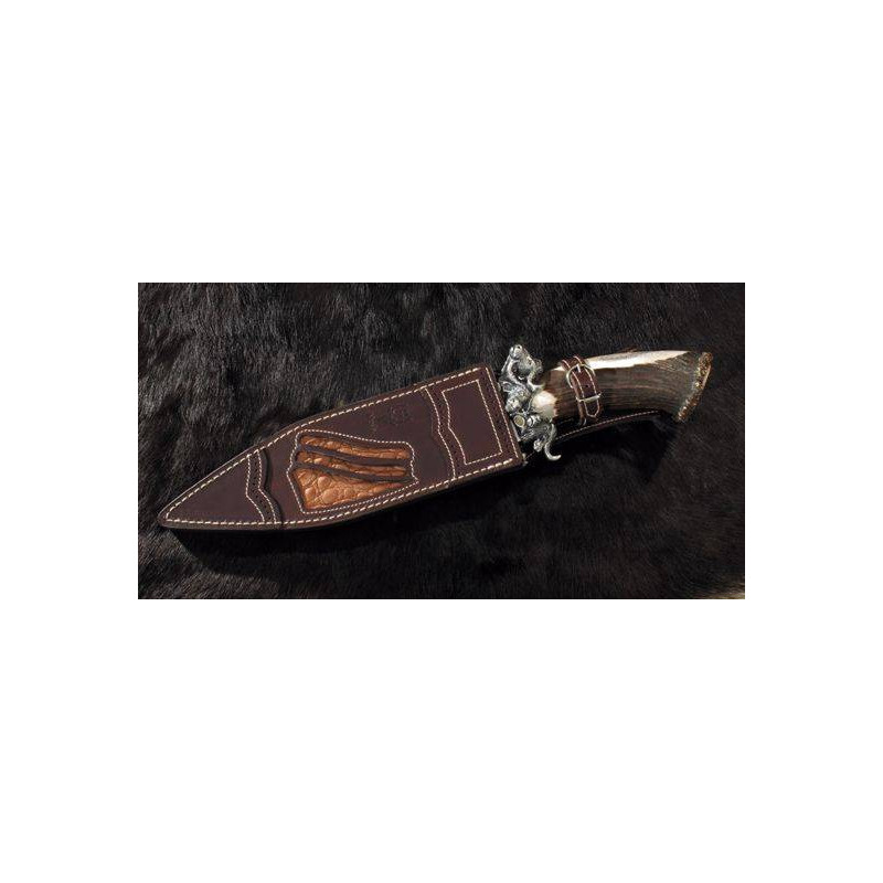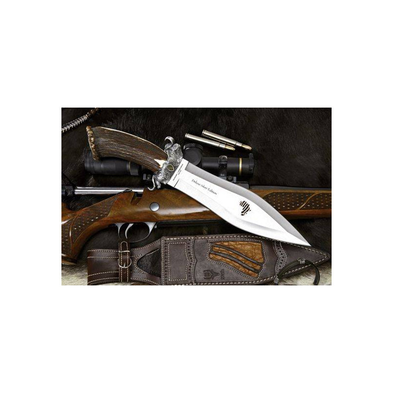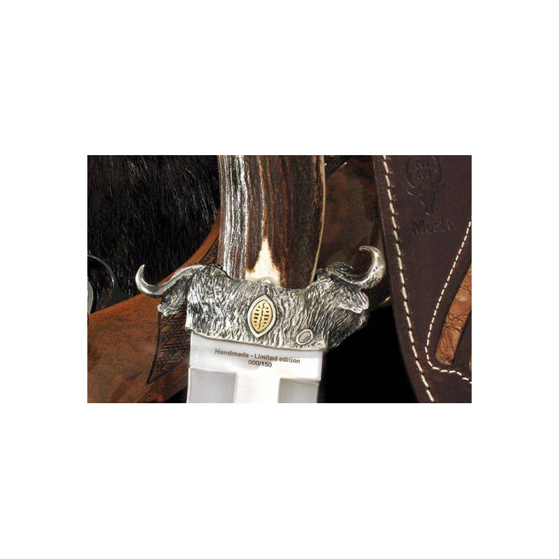 <p>- Coltello prodotto dal prestigioso marchio spagnolo Muela.<br />- Coltello da collezione dal design elegante e lussuoso. Edizione limitata e numerata di 150 esemplari.<br />- Manico in corno di cervo con rosetta decorata con pezzo in argento.<br />- Lama di circa 25 cm. in acciaio legato al cromo-vanadio.<br />- Guardia in argento con rilievo di bufalo. Comprende due pezzi d'oro con inciso il numero di serie e lo scudo Masai.<br />- Lama controtagliente concava scavata a tre tavoli. Include incisione laser su entrambi i lati.<br />- Include una fodera in pelle con pezzo di pelle di coccodrillo del Nilo.<br />- Presentato in un cofanetto di legno con incisioni della serie African Safari in copertina.<br /><br />Se vuoi saperne di più su questo coltello e sulla collezione clicca <a href="https://www.aceros-de-hispania.com/infer.asp?ac=12&trabajo=listar&pa=cuchillos-muela-safari&sg=cuchillos-muela-safari" style="font-family:Arial;line-height:15.199999809265137px;font-size:11px;">qui</a></p>