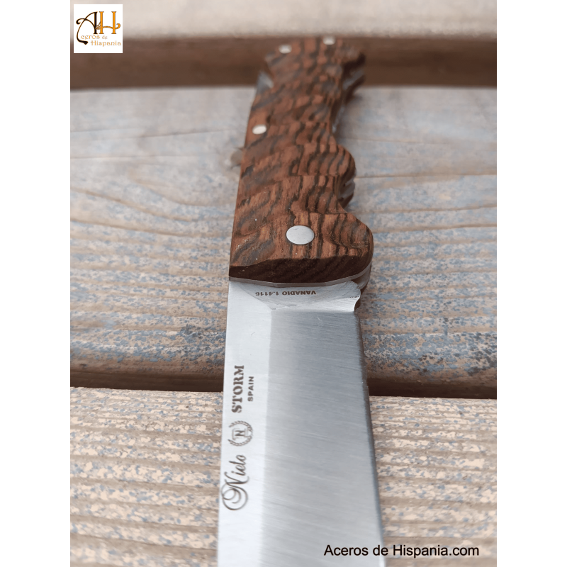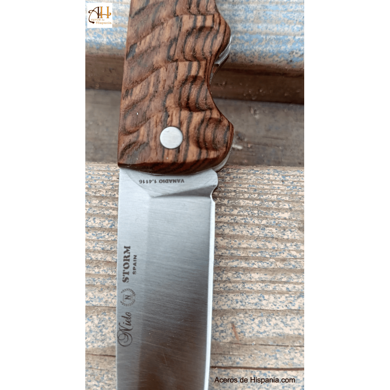 Storm Nieto Knives, il modello storm 200 è un coltello a lama in acciaio AN-58 con una lunghezza di 8,50 cm. Ha impugnature in legno di bocote naturale con un sistema di chiusura a bloccaggio. Ha una lunghezza totale di 19 cm, è un coltello molto leggero che pesa 100 grammi.