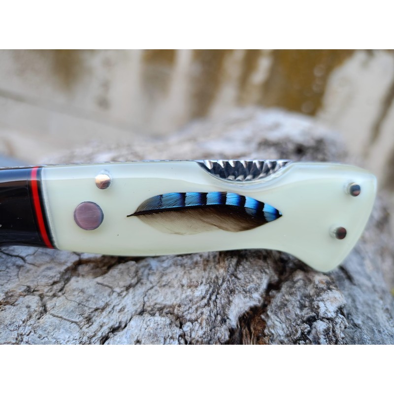 - Manico in resina ossea e metacrilato con inserto in piuma naturale