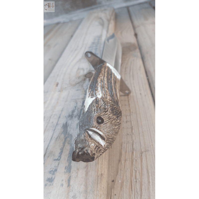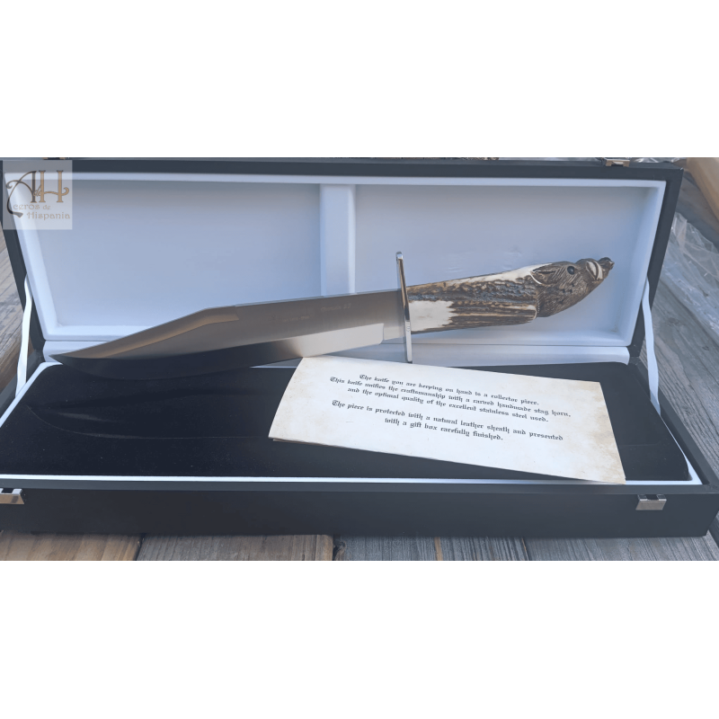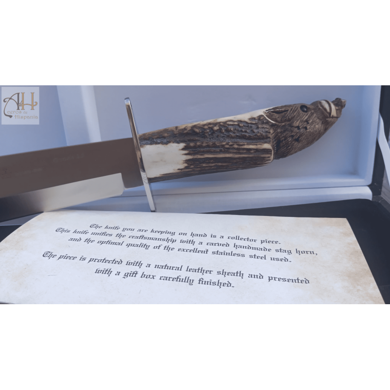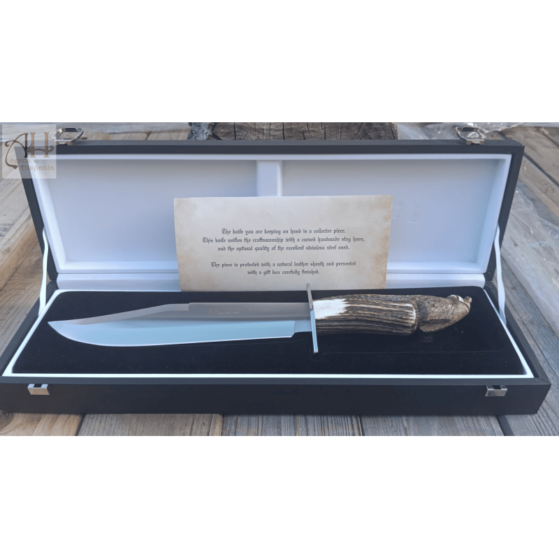 Il manico, realizzato in corno di cervo intagliato a mano, si distingue per la sua minuziosa lavorazione artigianale, rendendo ogni pezzo un'opera unica e irripetibile. La lama, realizzata in acciaio inox MOVA 1.4116, garantisce durata e resistenza, con una durezza di 55-57 HRC.