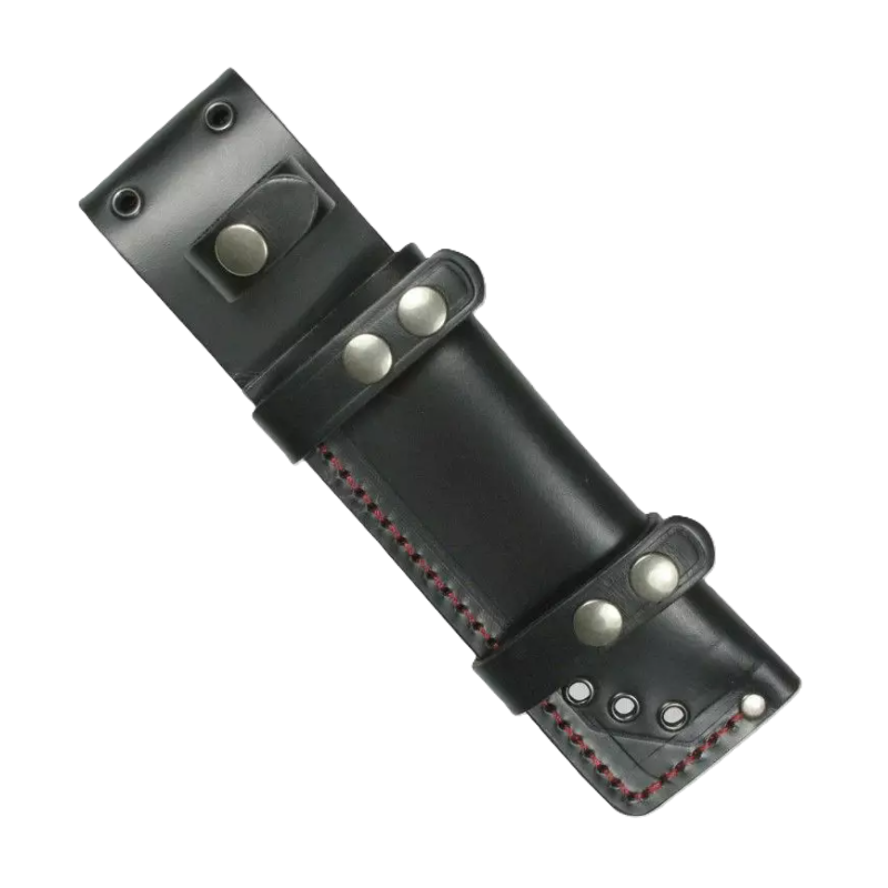 <p>A faca possui área projetada para fazer uso de sílex, furo iniciador para fazer fogo de atrito com arco, furo para corda, quebrador de vidro (afunilado), coluna arredondada para golpear sem danificar o bastão e as escamas são removíveis (opção de sobra). Inclui capa de couro preta multi-posição.</p>