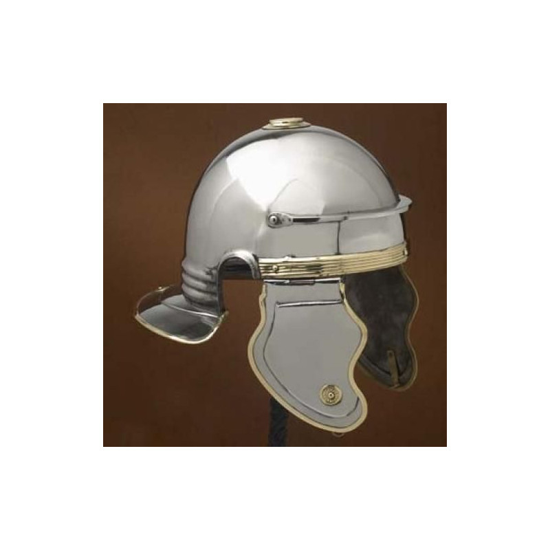 <p>Aço com guarnição em latão <br />A entrega inclui um chapéu de algodão acolchoado para uso sob o capacete <br />Adequado para perímetro cefálico até 61 cm <br />- Longa distância (de trás para frente): aprox. 23 cm <br />- Curta distância (orelha a orelha): aprox. 19,5 cm <br />- Peso: aprox. 1,6 kg</p>Réplica autêntica baseada em um capacete romano do século 1 encontrado em Bucareste, Romênia.<br /><br />