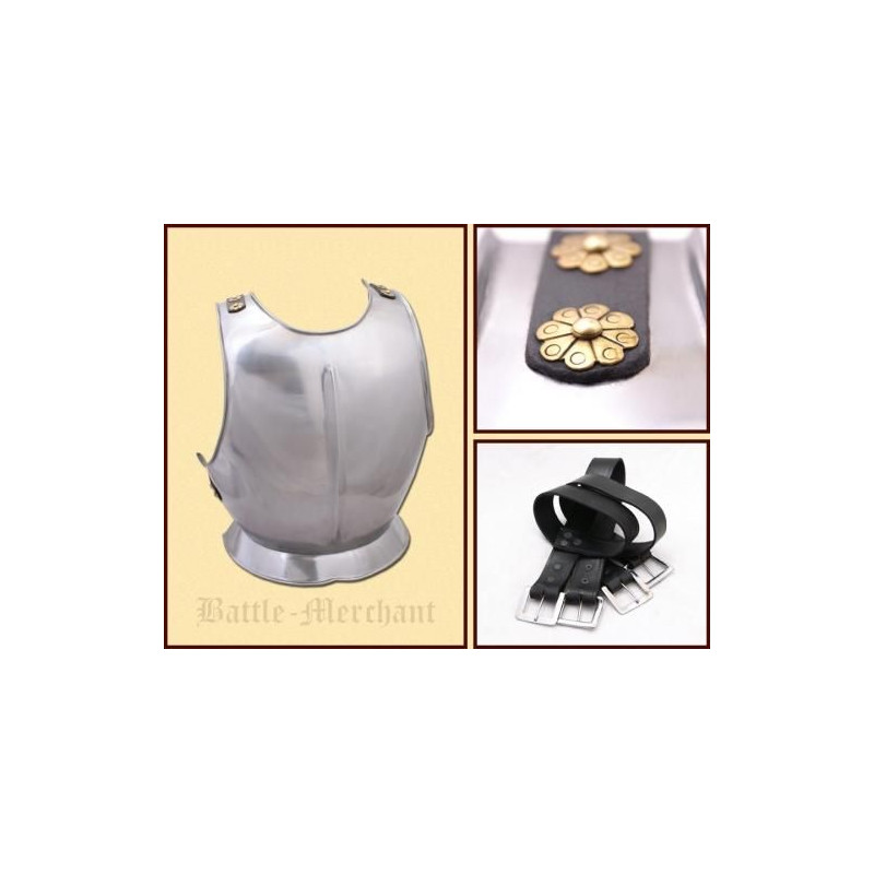 <p>Detalhes: <br />Material: 1.6mm chapa de aço, couro <br />Tamanho: Circunferência do peito: cerca de 140cm</p> <p> Circunferência da cintura: aprox. 120 cm</p> <p> Decote (diâmetro): aprox. 20,5 cm <br /> Comprimento: aprox. 51 cm <br /> Peso: aprox. 3,65 kg</p>Armadura com alça traseira Couraça portátil, pronta para a batalha, feita de aço de 1,6 mm de espessura.<br /><br /> Inclui duas correias ajustáveis de tamanho com fivelas nas costas.<br /><br /> O caimento generoso garante a liberdade adequada dos braços.<br /><br />