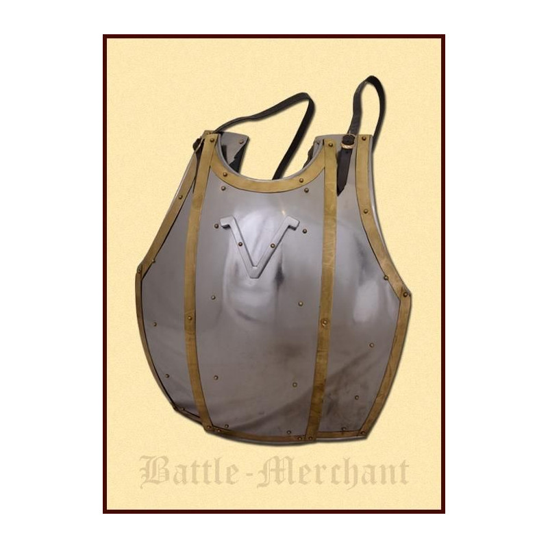 O babador é, portanto, extremamente flexível e se adapta bem à altura de seu usuário. Como o original, que pode ser visitado no sul do Tirol Churburg, nossa réplica tem uma borda de bronze e um sólido "V" no meio do peito.