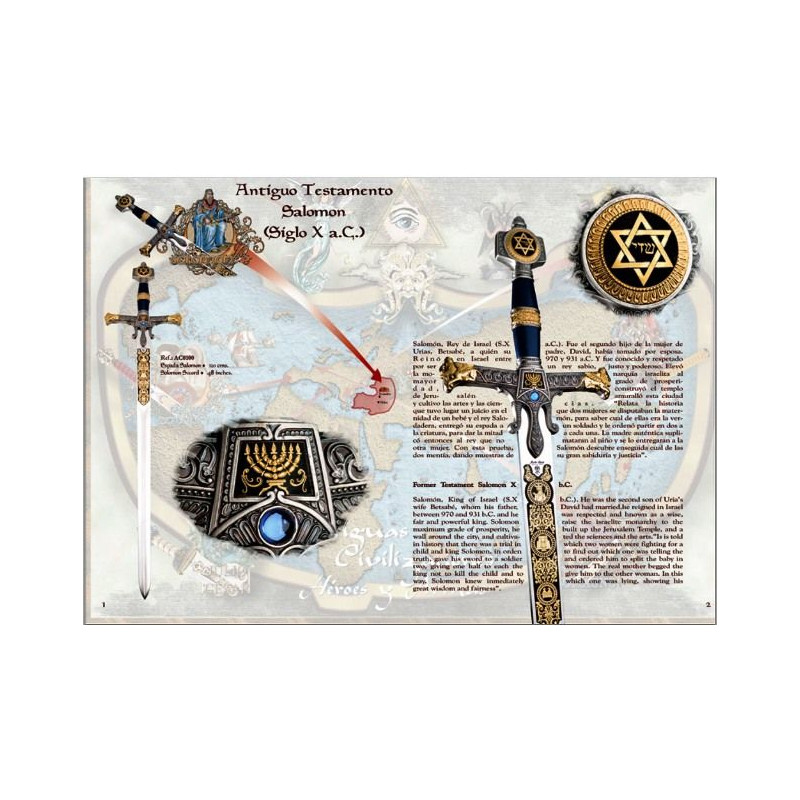 <p>O rei Salomão era um rei de Israel, conhecido por ser justo, sábio e poderoso. Ele construiu o templo de Salomão em Jerusalém, murou a cidade e fez dela um local de culto para as artes e ciências. A espada do rei Salomão tem as insígnias do judaísmo, como a estrela de Davi.</p>