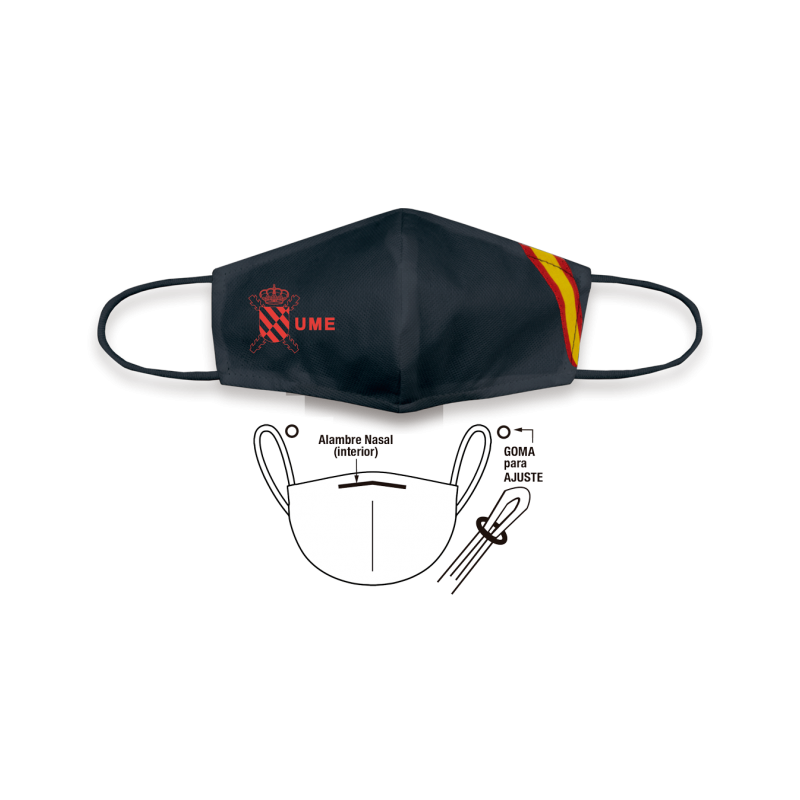 Fixação Facial<br />NÃO APROVADO<br />Material: TNT<br />Reutilizável<br />Cor: Preto<br />Modelo: UME<br />Características:<br />- Borracha para ajuste<br />- Fio do nariz<br />Fabricado em Espanha<br />AVISO: Como não é um dispositivo médico, não cumpre a Diretiva 93/42 ou o Regulamento UE/2017/745, nem é considerado EPI