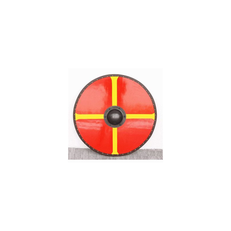 Escudo Viking. Cromo em vermelho e amarelo.<br />Diâmetro: 76 cm x 76 cm<br />Material: Madeira & Umbo de aço<br />Peso: 6 Kg<br />Fabricado por Windlass Steelcrafts®