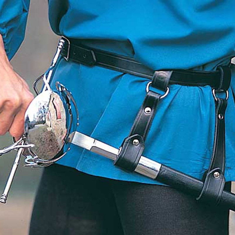 Este cinto com pulseira dupla é feito de couro durável. Projetado para carregar sua rapier ou espada. Este cinto preto tem 102 cm de comprimento e pode ser cortado em tamanhos menores. Decorado com encaixes de aço, cabe casulos entre 3 e 5 cm de largura. As alças podem ser movidas independentemente ao longo da correia para adaptar a inclinação da espada ao seu gosto e os ajustes permitem que as alças sejam adaptadas à largura da bainha. * Espada não incluída