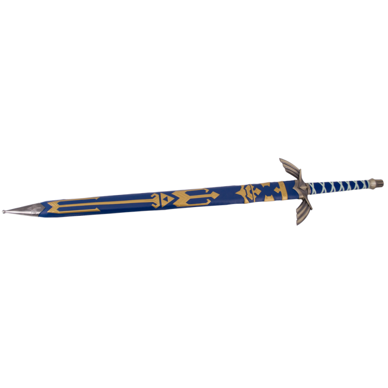 Espada S5003 Legend of Zelda modelo, modelo não oficial, com um tamanho total de 126,7 cm, lâmina de aço gravada e bainha de couro azul com detalhes dourados. Referência S5003