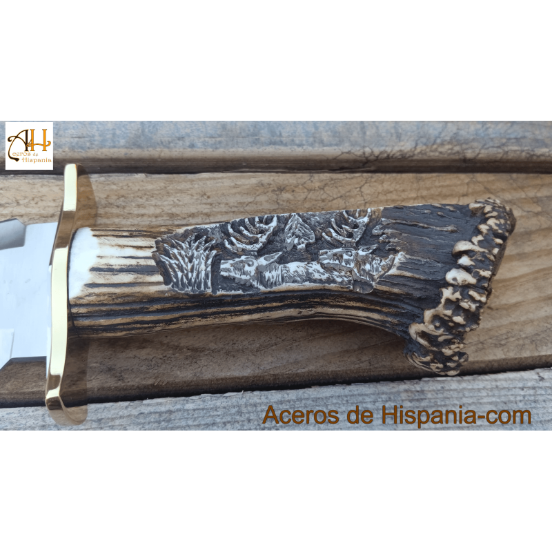 Faca com cabo de chifre de veado esculpido (cena de veado) com roseta e latão e defesa em aço inoxidável.