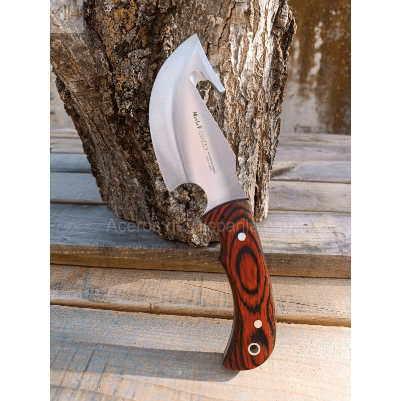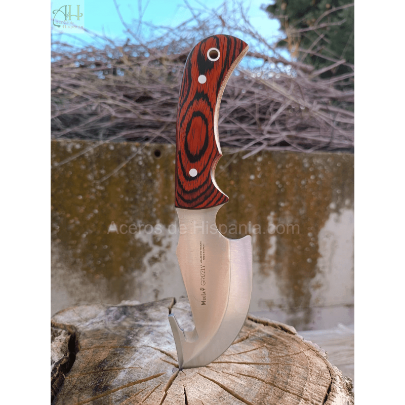 Facas Muela para caça. O modelo Grizzly 12R tem uma lâmina de 17 cm. A lâmina é de aço 440c sólido, este aço 440c é um aço inoxidável, é de alta resistência ao desgaste. O cabo tem um comprimento de 11,5 cm com escamas de madeira vermelha laminada.