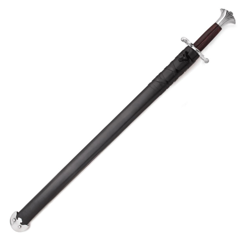 A bainha de couro preto é decorada com faixas de couro que cruzam e dão nó e é coberta com uma ponta de aço.