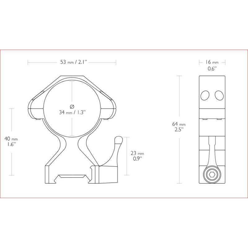<p>Modelo alto</p> <p>Tamanho do anel (diâmetro) 34 mm</p> <p>Tecelão Ferroviário</p> <p>Configuração de 2 peças</p> <p>Encadernações (Superior) Torx Duplo (T15)</p> <p>Rosca (parte superior) 6-48</p> <p>Fixadores (trilho) Alavanca</p> <p>Rosca (trilho) 8-32</p> <p>Almofada interna Não</p> <p>Pino de Parada de Recuo Retrátil Não</p> <p>Altura 2.5" 64 mm</p> <p>Peso: 8,9 onças, 252 g</p>