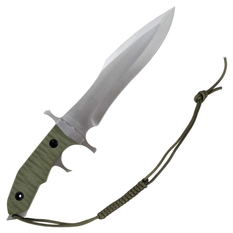 Facas Rambo, este Rambo V tem uma lâmina de aço de 23 cm e um cabo de polímero com um cabo. Tem um comprimento total de 38,5 cm. A faca Rambo pesa aproximadamente 550 gramas.
