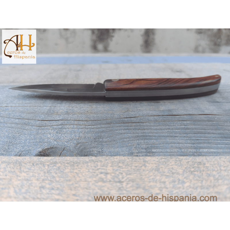 Canivete Muela com punhos de cocobolo, tem um cabo de 13 cm feito de madeira de cocobolo e rebitado. O sistema de fecho é de pistão. Tem um comprimento total de 21,5 centímetros. O canivete inclui a bainha.