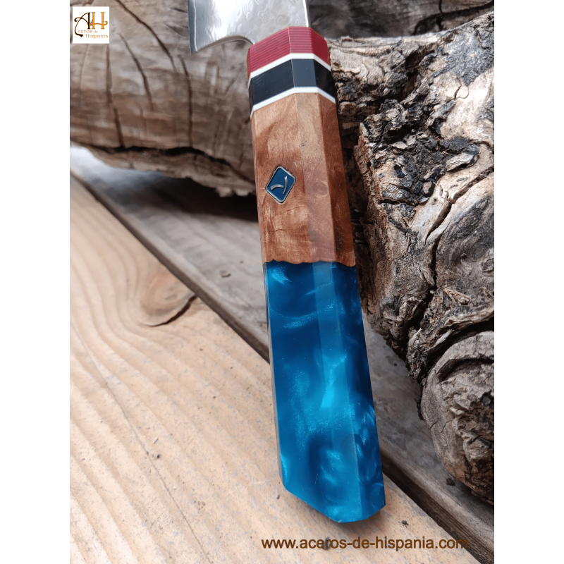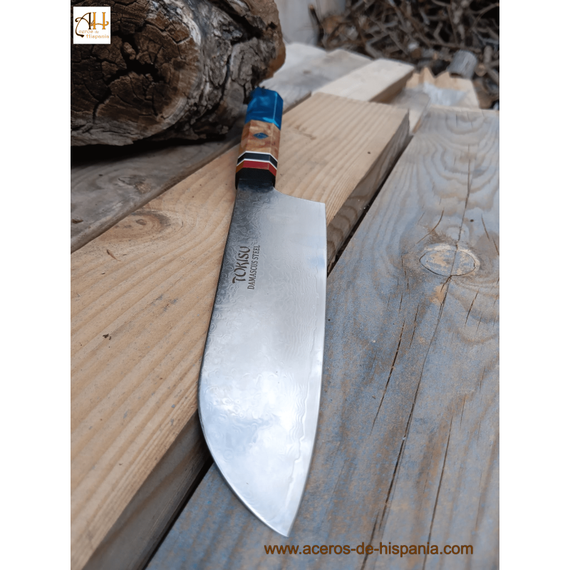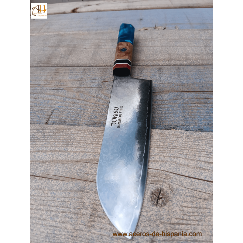 Faca de cozinha estilo japonês, Santoku Tokisu. Com uma lâmina de 19,5 centímetros de comprimento feita de aço Damasco de 67 camadas e uma espessura de 2,5 mm. É uma faca de cozinha Santoku ideal para cortar, cortar ou filetar carne. A alça é de staypack com um comprimento de 13 cm. Tem um comprimento total de 32,5 centímetros e é muito leve de manusear, pesando 185 gramas.