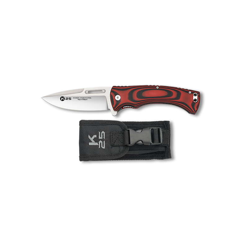 O design da faca K25 é complementado pelos punhos G10, que simulam o aspeto da madeira de wenge vermelha. Este material não só proporciona uma aderência segura, como acrescenta um toque estético que o distingue de outras facas existentes no mercado. A combinação de cores vermelho e preto confere-lhe um carácter moderno e elegante.