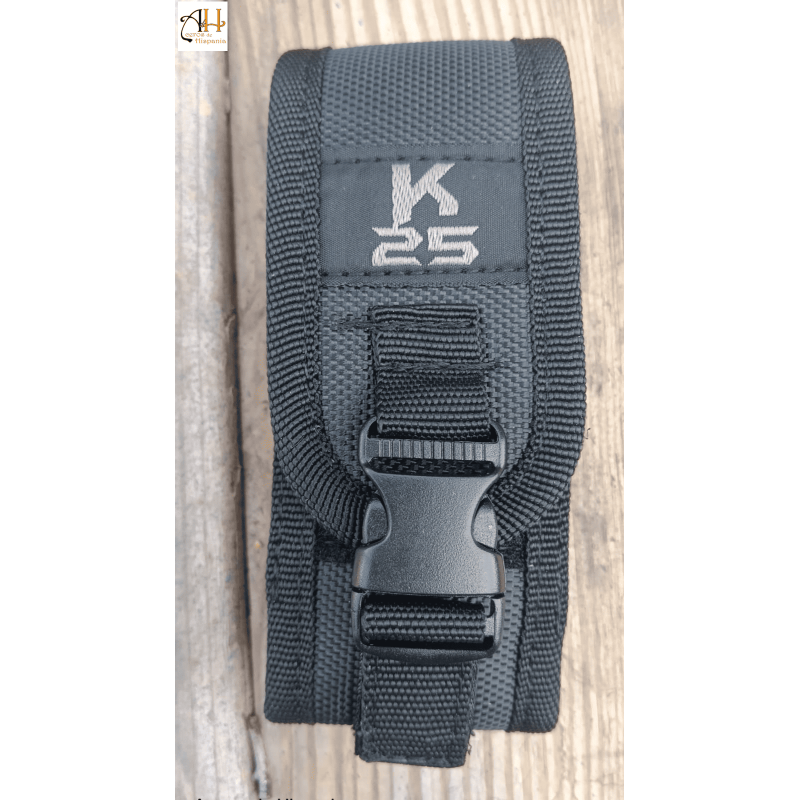 A faca K25 inclui uma bainha de nylon preta para facilitar o transporte e armazenamento. Esta bainha protege a faca de possíveis danos e permite que seja transportada em segurança num cinto ou numa mochila.