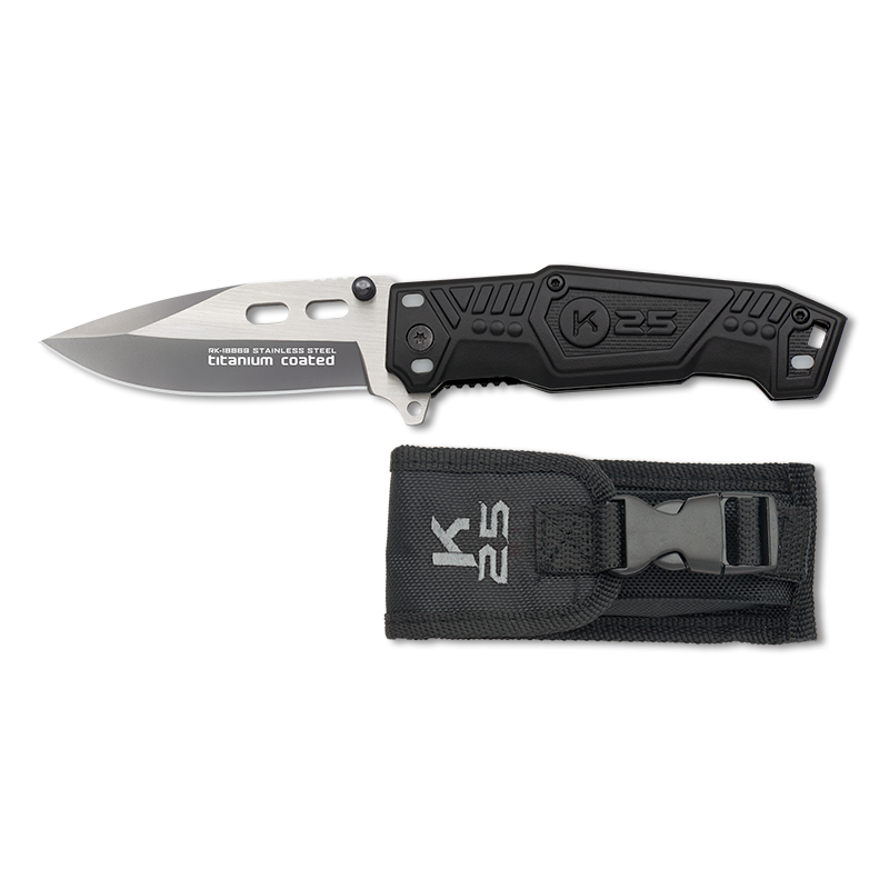 <p>Tactical Knife K25 com detalhes reflexivos no cabo para ver a faca no escuro.</p> <p> <p>Tamanho da lâmina: 7,80 cm</p> <p>Tamanho do punho: 10,00 cm</p> <p>Tamanho Total: 17.80 cm</p> <p>Tipo de aço: 3Cr13MoV</p> <p>Espessura da lâmina: 2,70 mm</p> <p>Pega: Alumínio Preto</p> <p>Teton: Sim</p> <p>Fliper: Sim</p> <p>Lâmina de corte de correia dupla</p> <p>Disjuntor de vidro de tungstênio</p> <p>Tipo de fechadura: Fechadura do forro</p> <p>Massa: 102 g</p>