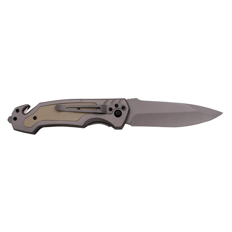 Punho em aço cinzento revestido a titânio com inserção G10 castanha texturizada.
